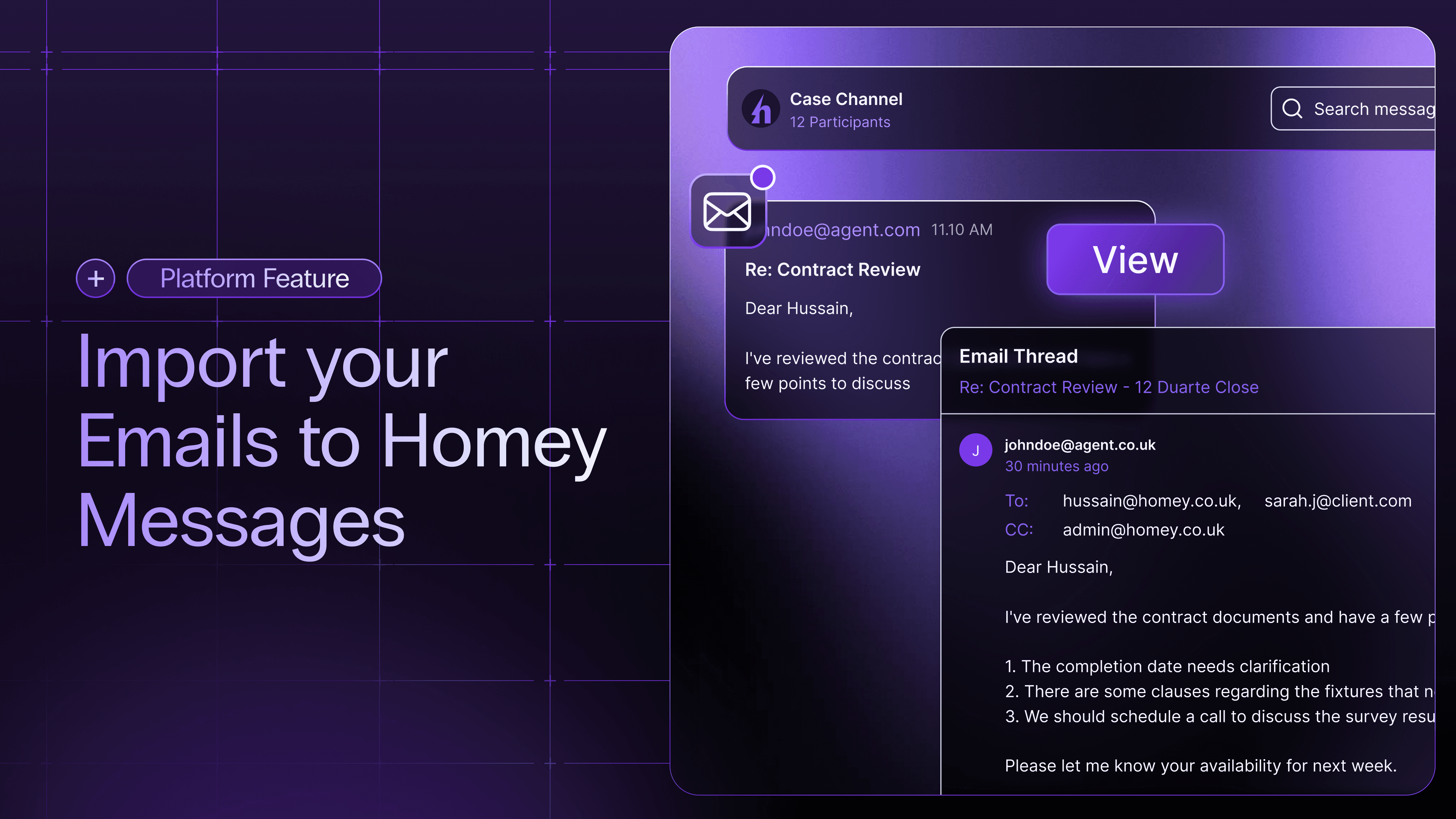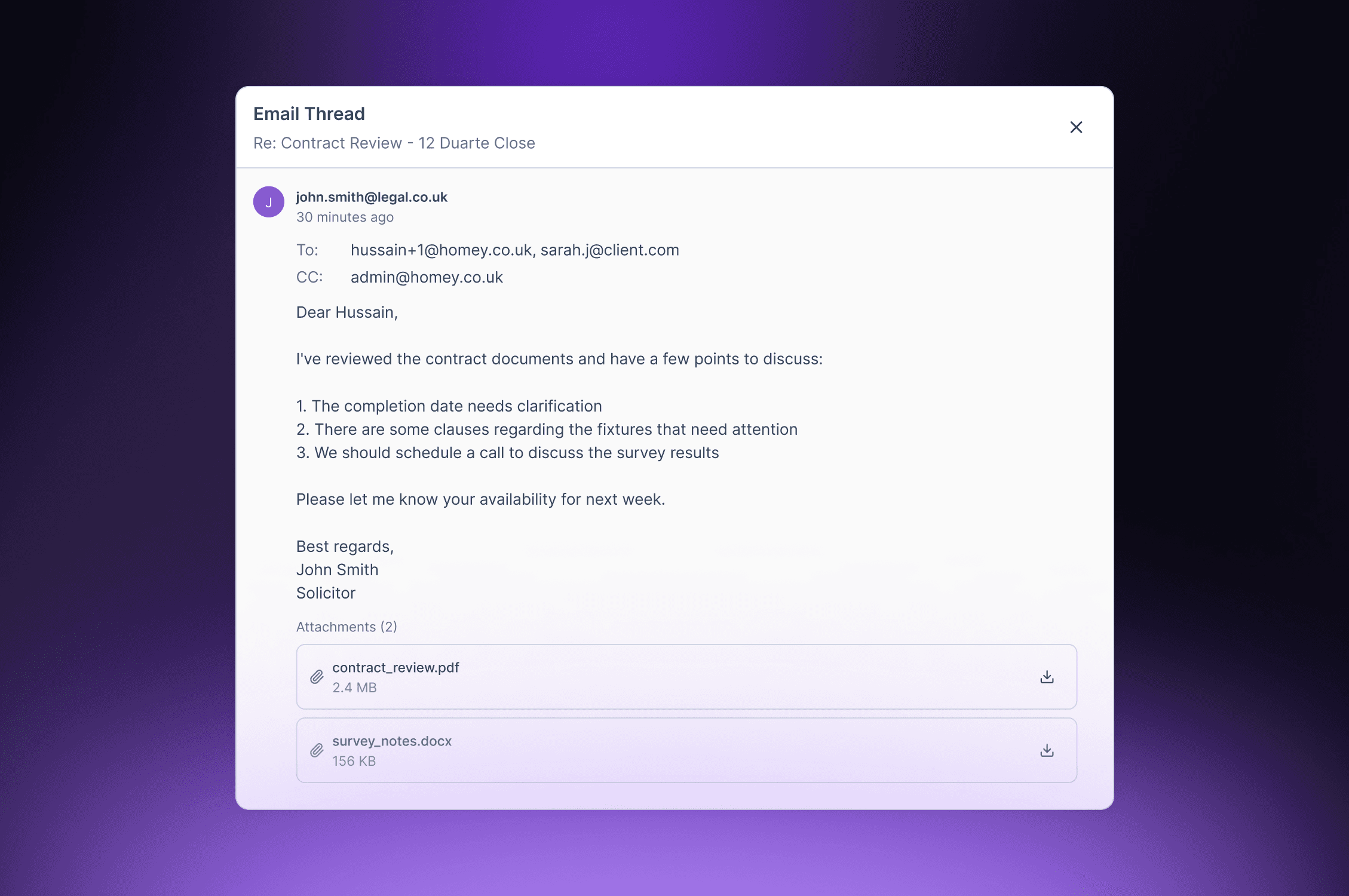 Currently, communication between conveyancers, clients, and external parties is often split across external email systems and the Homey platform. This fragmentation makes it difficult to trace case histories and forces you to manually dig for past correspondence.