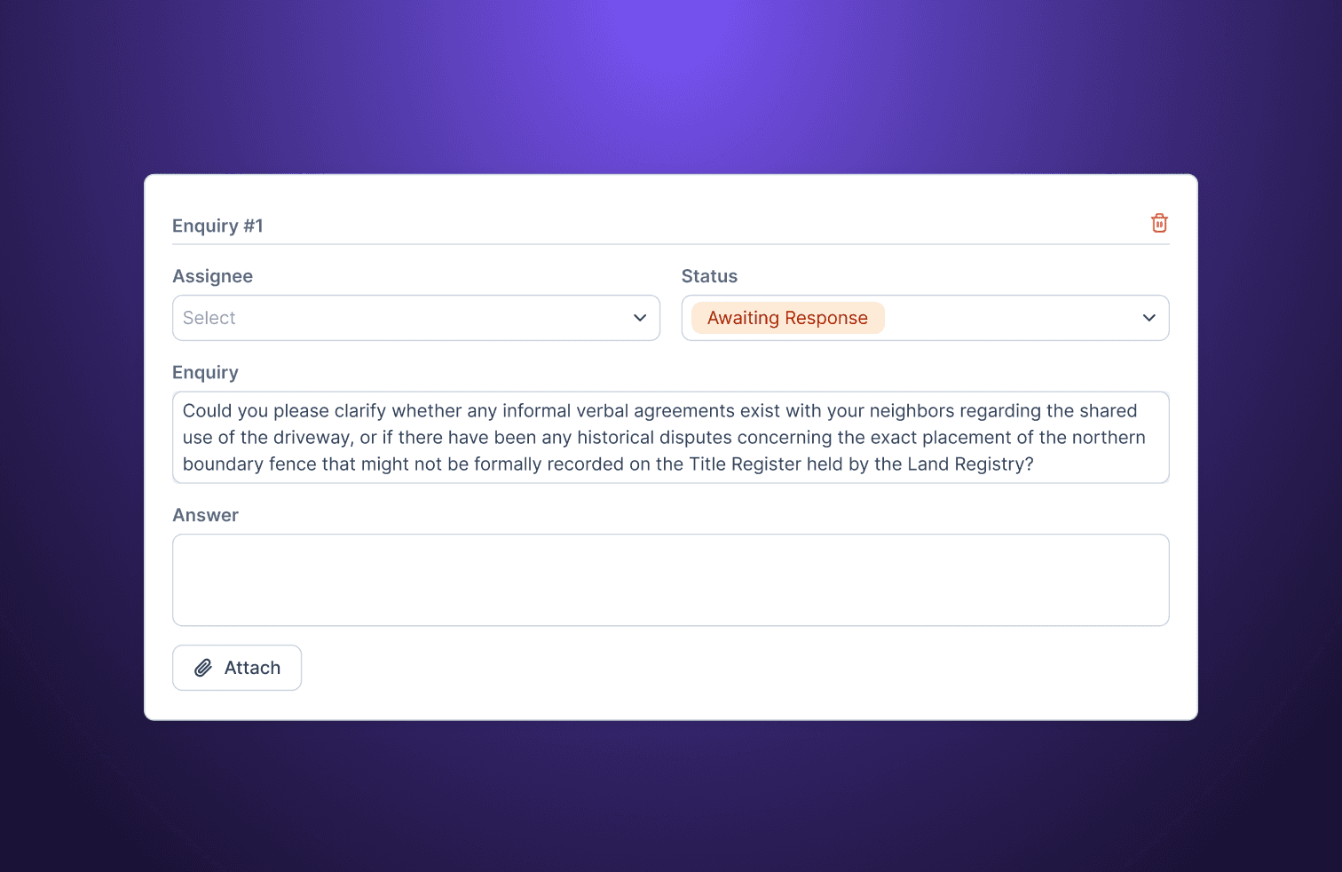 We have eliminated the "Save" button to create a truly modern, responsive experience. As you update an assignee or edit a response, the system saves your changes instantly, ensuring data persistence even if you navigate away. For clients, this means they can provide answers at their own pace without fear of losing progress. For solicitors, it means the "Professional View" always reflects the most current information available, backed by an activity log that tracks every single interaction.